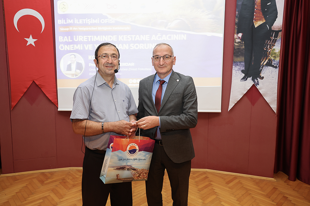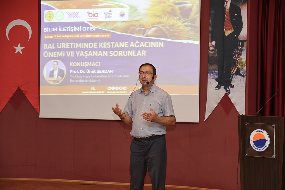 Üniversitemiz Bilim İletişimi Ofisi ile Doğal Ürünler Uygulama ve Araştırma Merkezi tarafından, Sinop İli Arı Yetiştiricileri Birliği’nin katkılarıyla bölgenin en önemli tarımsal ürünlerinden biri olan kestane balının geleceğini tartışmak amacıyla “Bal Üretiminde Kestane Ağacının Önemi ve Yaşanan Sorunlar” başlıklı konferans gerçekleştirildi.