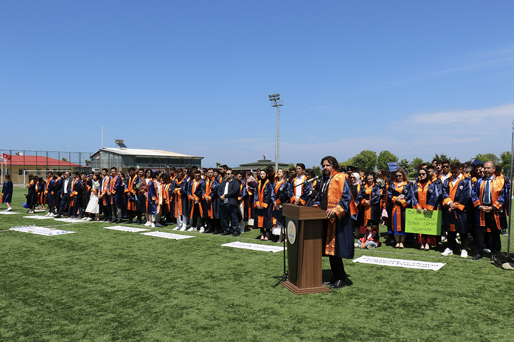 Programda selamlama konuşması yapan Rektör Yardımcımız Prof. Dr. Rıza Bayrak, “Bugün öğrencilerimizi mezun etmenin heyecanını, pırıl pırıl gençlerimizi hayata uğurlamanın, ülkemize kazandırmanın gururunu ve sevincini yaşıyoruz. Öğrencilerimizi tebrik ediyor, bundan sonraki hayatınızda hepinize sağlık, mutluluk ve üstün başarılar diliyorum.” dedi.