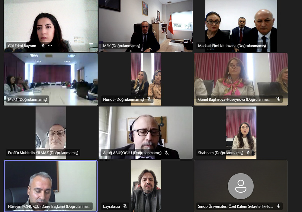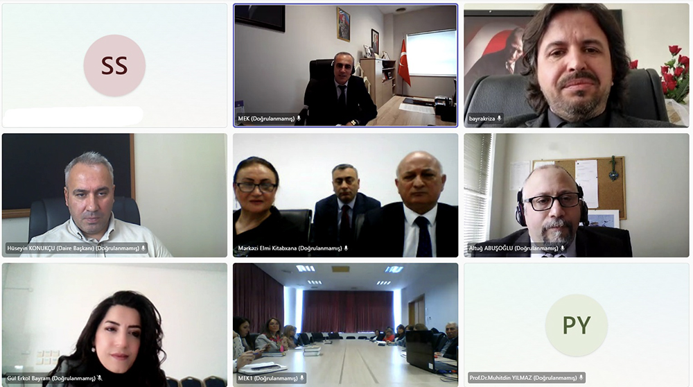 Çevrim içi düzenlenen toplantıya Rektör Yardımcılarımız Prof. Dr. Muhittin Yılmaz ve Prof. Dr. Rıza Bayrak, Azerbaycan Milli Bilimler Akademisi Kütüphanesi Direkdörü Hüseyn Hüseynov, Kütüphane ve Dokümantasyon Başkanı Hüseyin Konukçu, Kütüphane Dijitalleştirme, İnovasyon ve Elektronik Hizmetler Müdür Yardımcısı, Tarih Doktoru Oruj Guliyev, Kütüphane Müdür Yardımcısı, Filoloji Doktoru Doçent Şahla Guliyeva, Şube Müdürü Mubariz Goyuhlu, iki kurumun akademisyenleri ve kütüphane personeli katılım sağladı.