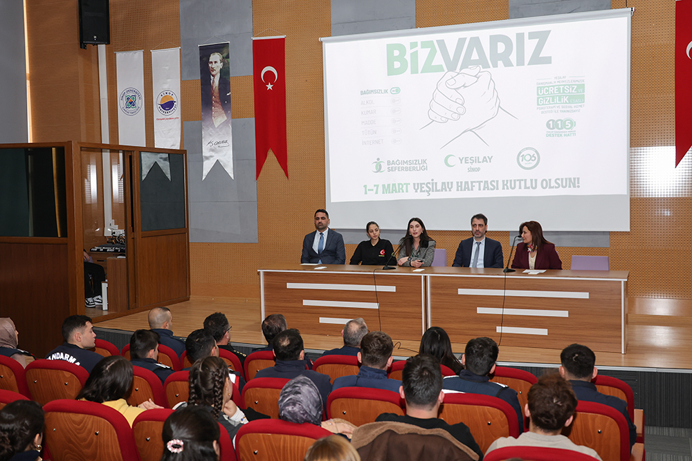 Alanında uzman konuşmacıların yer aldığı programda; Sinop İl Sağlık Müdürlüğünden Halk Sağlığı Uzmanı Uzm. Dr. Selim Güler, Yeşilay Danışmanlık Merkezi (YEDAM) Sosyal Hizmet Uzmanı Nazlı Deniz Saral, Sinop İl Jandarma Komutanlığından J. Asb. Üçvş. Mehmet Umur Çavdar ile Sinop İl Emniyet Müdürlüğünden Polis Memuru Gökçe Yaren Ateşli tarafından bağımlılıkla mücadeleye yönelik kapsamlı sunumlar gerçekleştirildi.